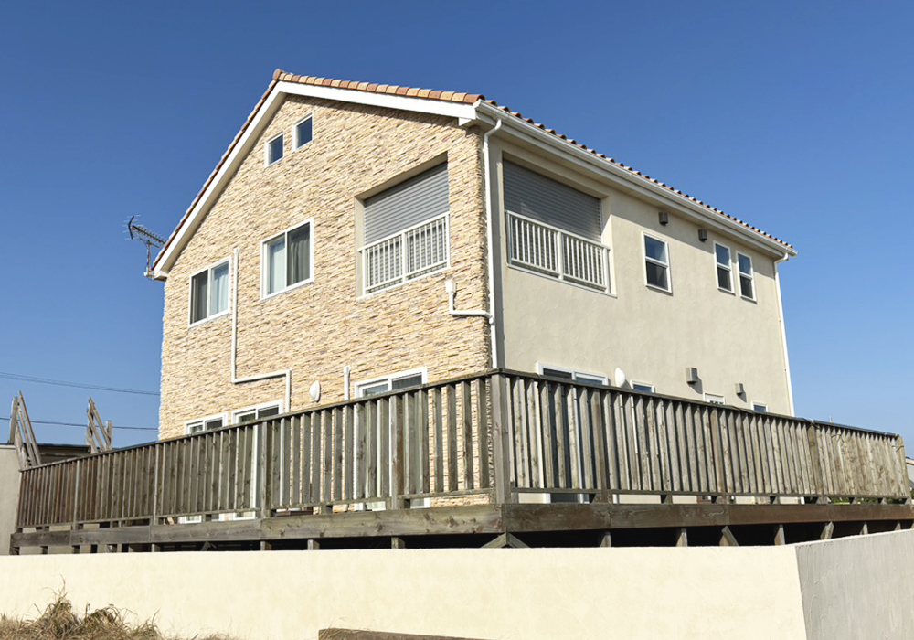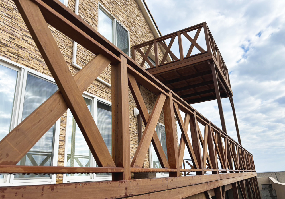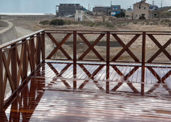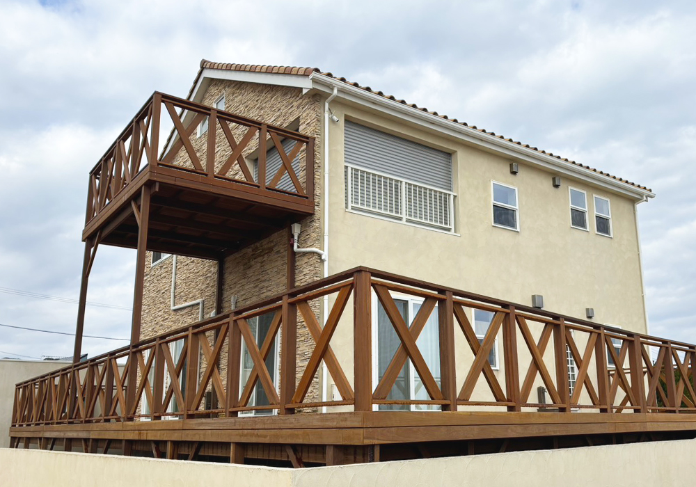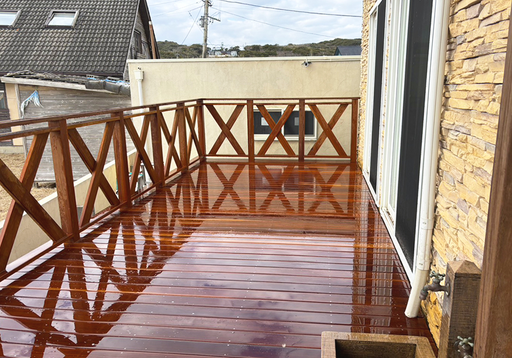 劣化したバルコニーを、潮風にも強いウリン材を使用し鮮やかに蘇がえりました。 沿岸の眺めの良いバルコニーが、さらに気持ちの良いものとなりました。