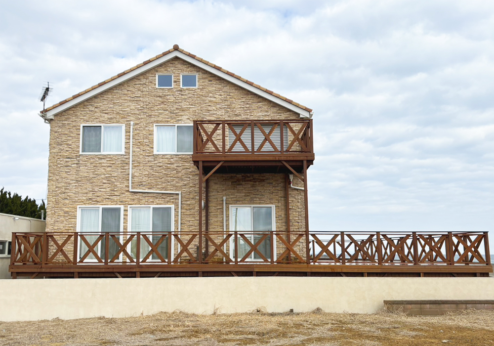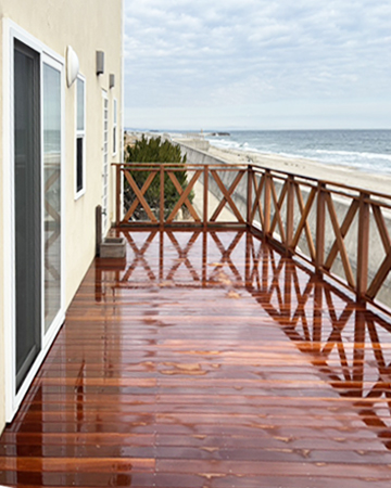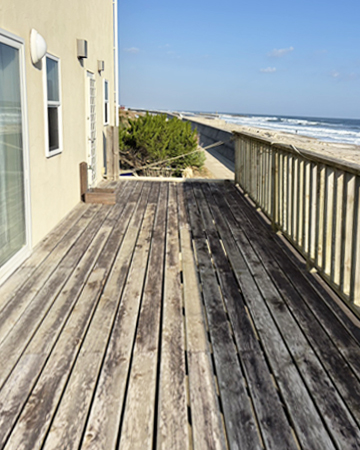 劣化したバルコニーを、潮風にも強いウリン材を使用し鮮やかに蘇がえりました。 沿岸の眺めの良いバルコニーが、さらに気持ちの良いものとなりました。